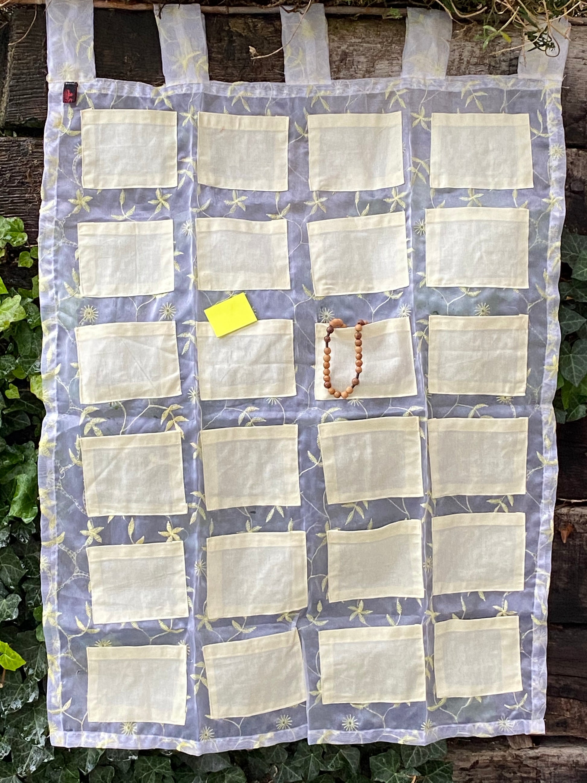 Du erhältst hier einen leichten, textilen Wandbehang mit 24 aufgenähten Stofftaschen. Der Kalender ist bereits fertig gestellt, er muss nicht extra genäht, sondern nur noch aufgehängt und gefüllt werden. Die Kinderaugen werden leuchten, wenn sie diesen Adventskalender mit lieben Kleinigkeiten am 1. Dezember vorfinden.