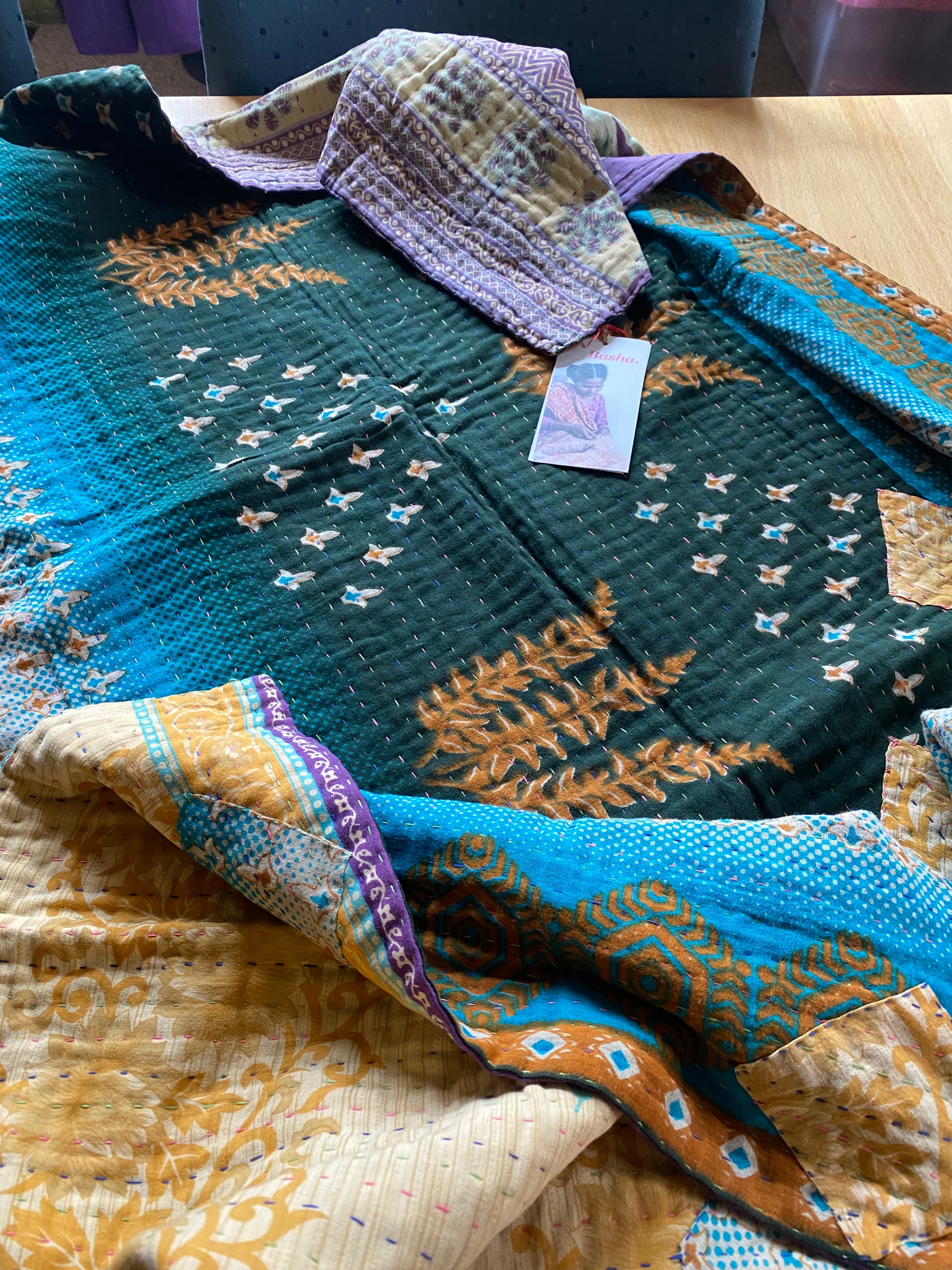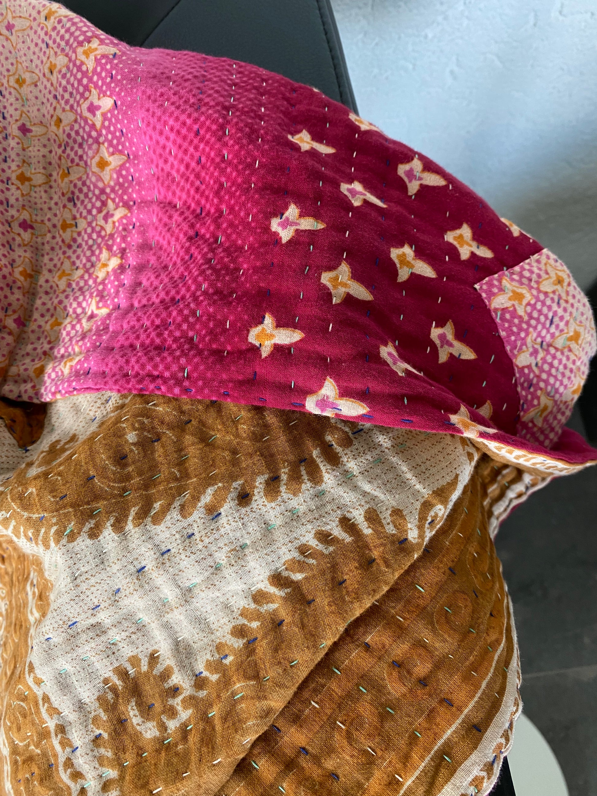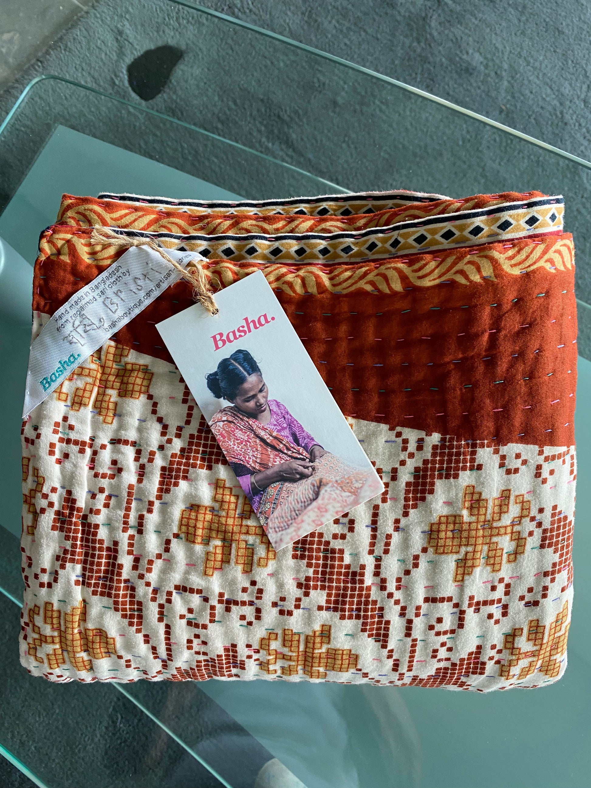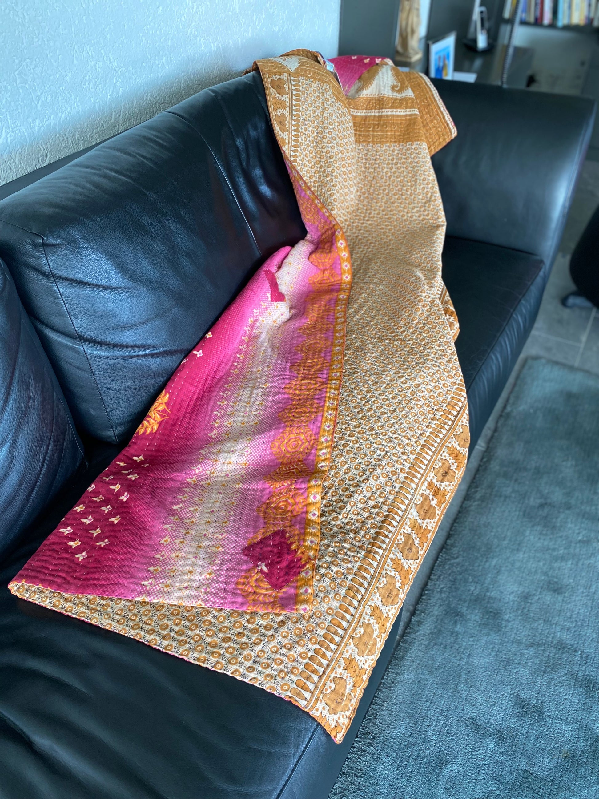 In Bangladesch ist es eine liebevolle Geste, wenn Grossmütter aus alten Baumwoll-Saris zur Geburt ihrer Enkel eine solche Decke anfertigen. Unsere Version knüpft an diese Tradition an.