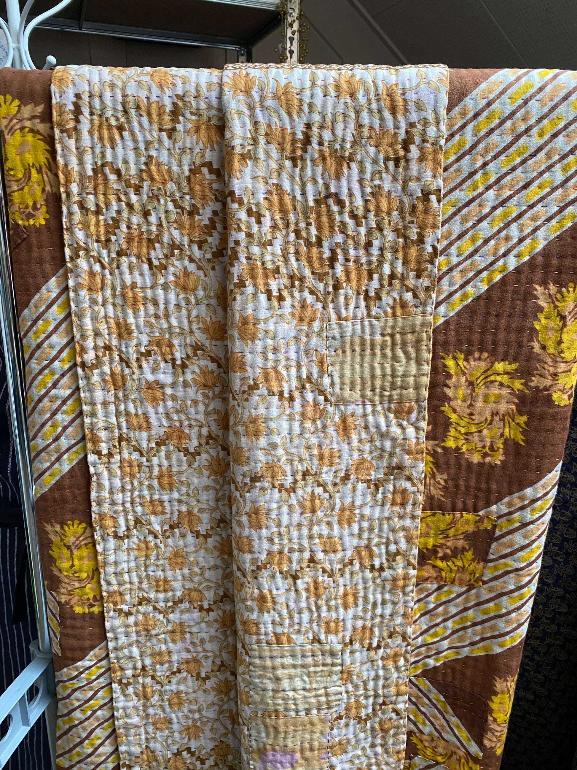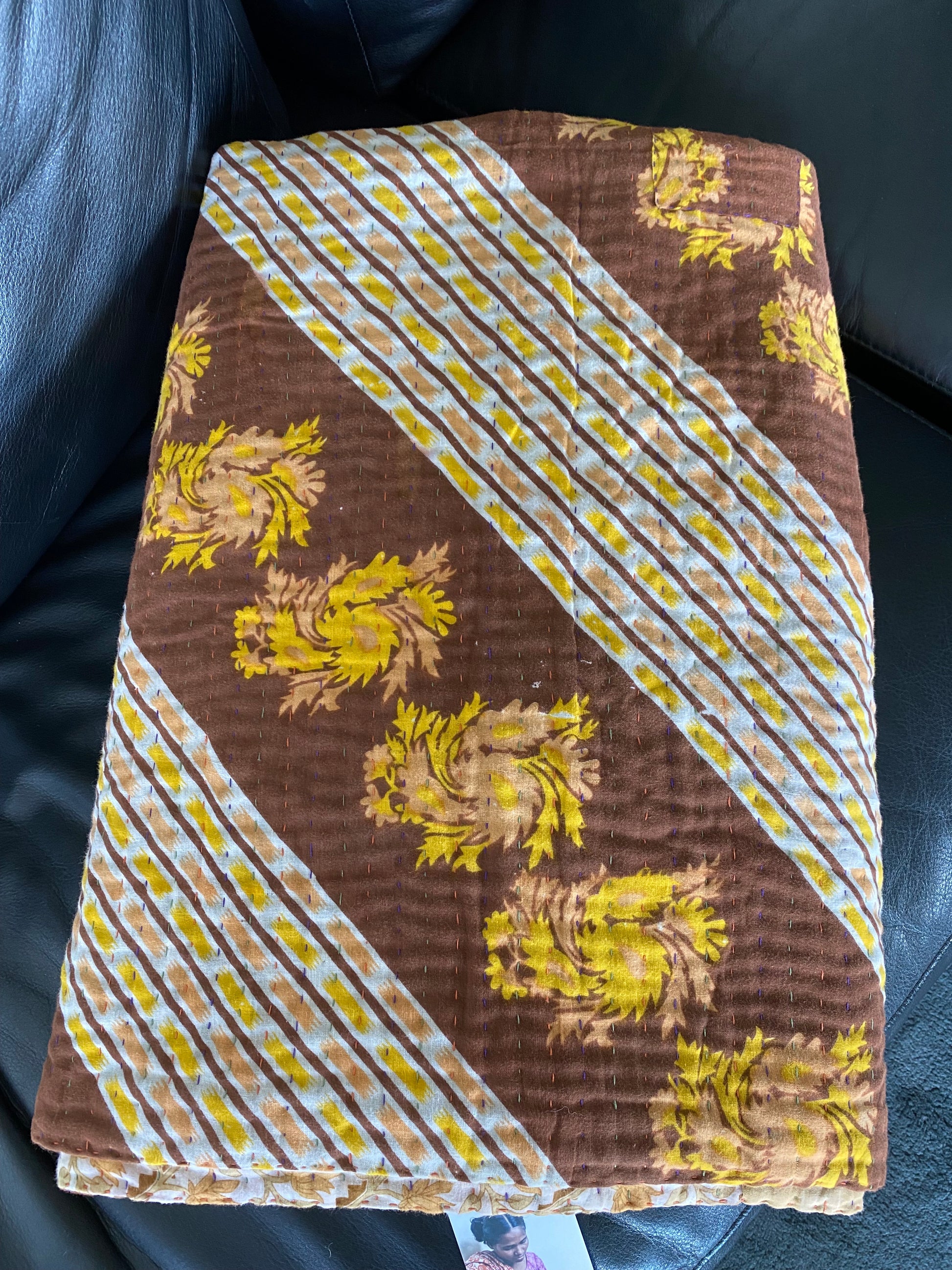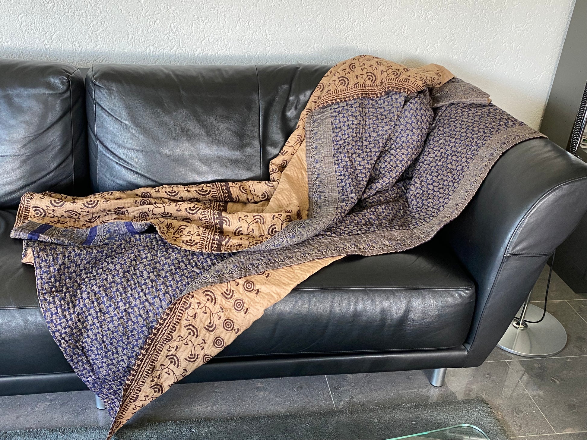 Dieses hochwertigen Decken werden in Handarbeit aus reiner Baumwolle gefertigt. Jedes Tuch ist ein Unikat – Die alte, traditionelle Technik des Kantha- Quiltens erfordert viel Geduld und Handfertigkeit. Die Stiche müssen auf beiden Seiten gleichmässig lang sein.