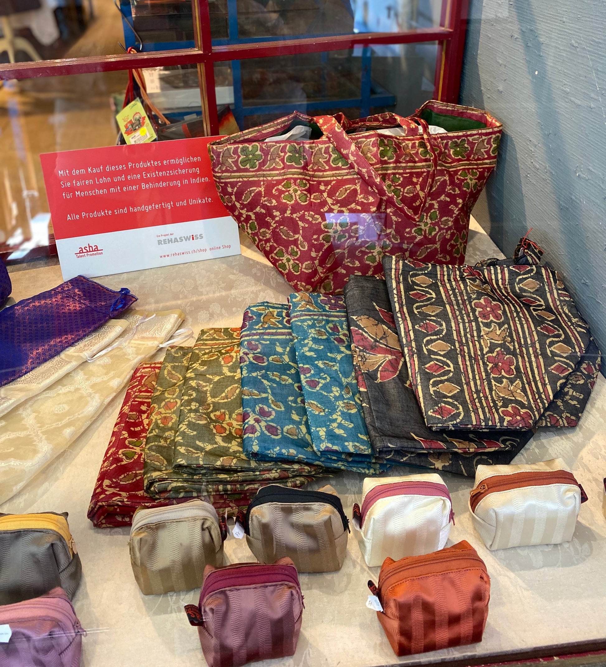 Mit dem Kauf dieses Produktes ermöglichen Sie fairen Lohn und eine Existenzsicherung für Menschen mit einer Beeinträchtigung, vor allem Frauen in Kerala, Indien. Alle Artikel sind handgefertigt in Heimarbeit und Unikate. Der Erlös wird reinvestiert in dieses Frauenprojekt. Siehe auch www.rehaswiss.ch